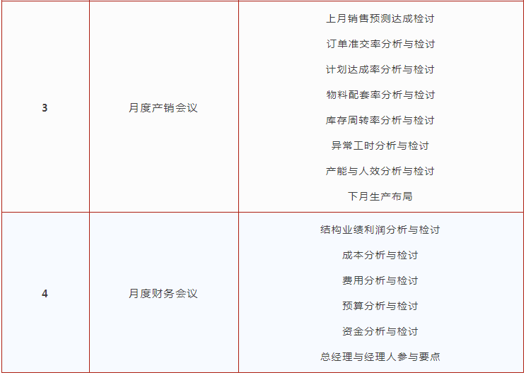 1、釋放總經(jīng)理,讓總經(jīng)理每周只上一天班 2、解放總經(jīng)理,讓總經(jīng)理每月開好四個會,每周只上一天班 3、月度經(jīng)營會議:解決產(chǎn)、銷、研、人、財、物各部門月度目標(biāo)達(dá)成問題 4、月度行銷會議:解決企業(yè)業(yè)績、市場與帳款問題 5、月度產(chǎn)銷會議:解決企業(yè)產(chǎn)銷不平衡的問題 6、月度財務(wù)會議:解決企業(yè)利潤、成本、費用、預(yù)算、資金問題 7、幫助總經(jīng)理平衡達(dá)到經(jīng)營結(jié)果:銷、產(chǎn)、利平衡發(fā)展