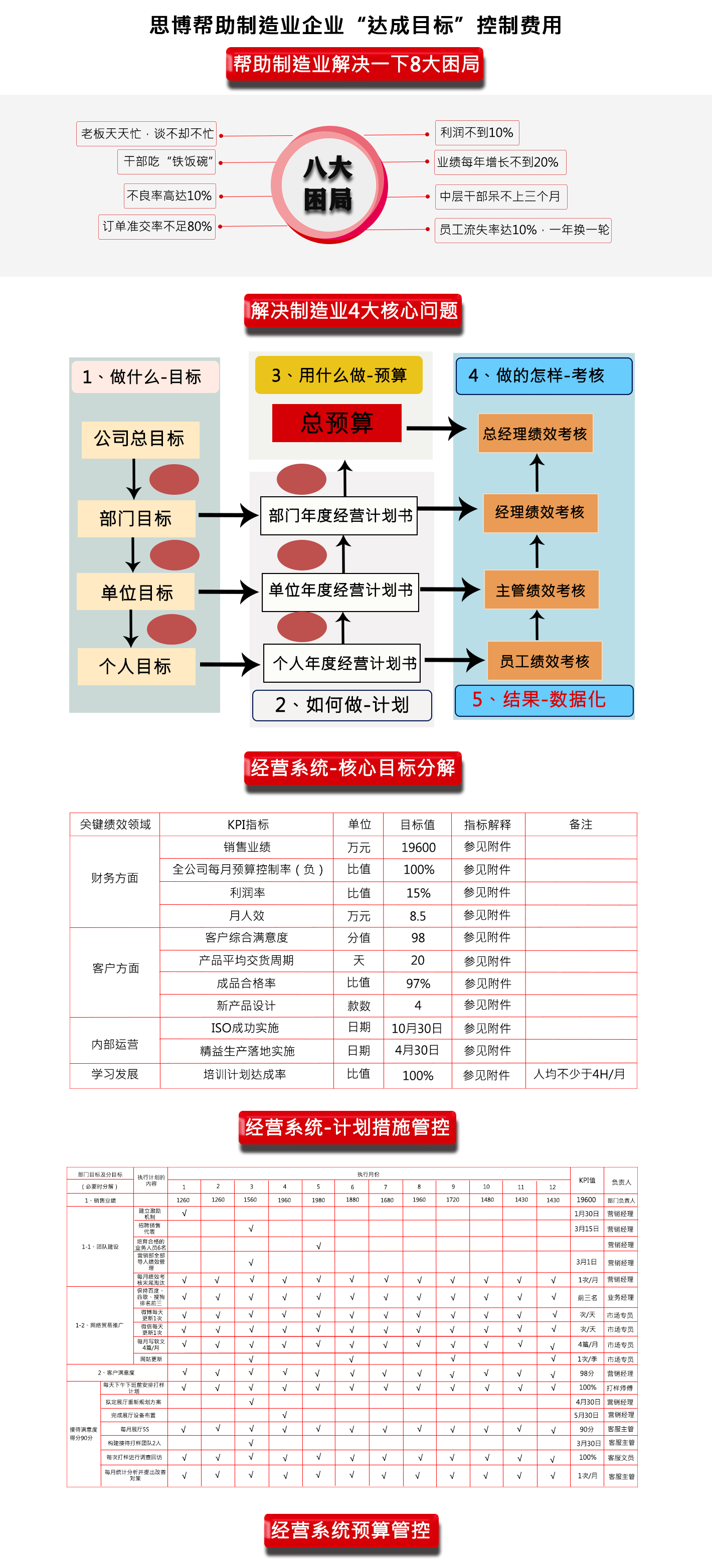 深圳市思博企業(yè)管理咨詢有限公司(sinbo) 是擁有多年管理實(shí)踐的實(shí)戰(zhàn)型管理咨詢企業(yè),思博數(shù)十人的咨詢師團(tuán)隊(duì)用近十年的時(shí)間潛心研究世界管理大師彼特·德魯克的目標(biāo)管理及臺(tái)灣陳宗賢教授的企業(yè)經(jīng)營(yíng)計(jì)劃管理,同時(shí)深入日本、臺(tái)灣、歐美等知名企業(yè)學(xué)習(xí)先進(jìn)管理理念及技能,結(jié)合中國(guó)企業(yè)本土化的特點(diǎn),成功研究出一套適合中國(guó)國(guó)情的企業(yè)經(jīng)營(yíng)管理系統(tǒng)《企業(yè)年度經(jīng)營(yíng)計(jì)劃與全面預(yù)算管理》。該系統(tǒng)在思博團(tuán)隊(duì)的潛心指導(dǎo)下,已成功幫助中國(guó)數(shù)百家企業(yè)實(shí)現(xiàn)年業(yè)績(jī)?cè)鲩L(zhǎng)40%