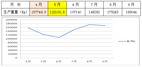 2、產(chǎn)量提升。突破170噸/月,8月份達(dá)到175噸,比7月份增產(chǎn)約27噸,9月份與5月份同比增長了38.44%;